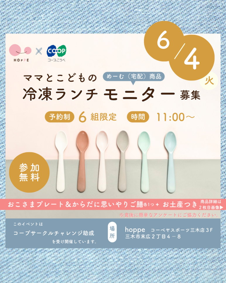 めーむ(宅配)冷凍ランチの試食をみんなで楽しみましょう!こども用1つ、大人用1つはhoppeでレンジ調理から試食まで行ってください。※試食対象商品は画像をご確認ください。コープこうべからサンプルをお渡ししますので、保冷バッグをご持参ください。【日時】2024/6/4(火)11:00~【定員】6組【対象】乳幼児親子【料金】無料 ※こちらのイベント参加の方は、hoppe「親子のibasho」利用料も不要です。【持物】保冷バッグ、スプーン、お箸、のみもの(必要な方)【場所】hoppe コーベヤスポーツ三木本店3階(三木市末広2丁目4-8)