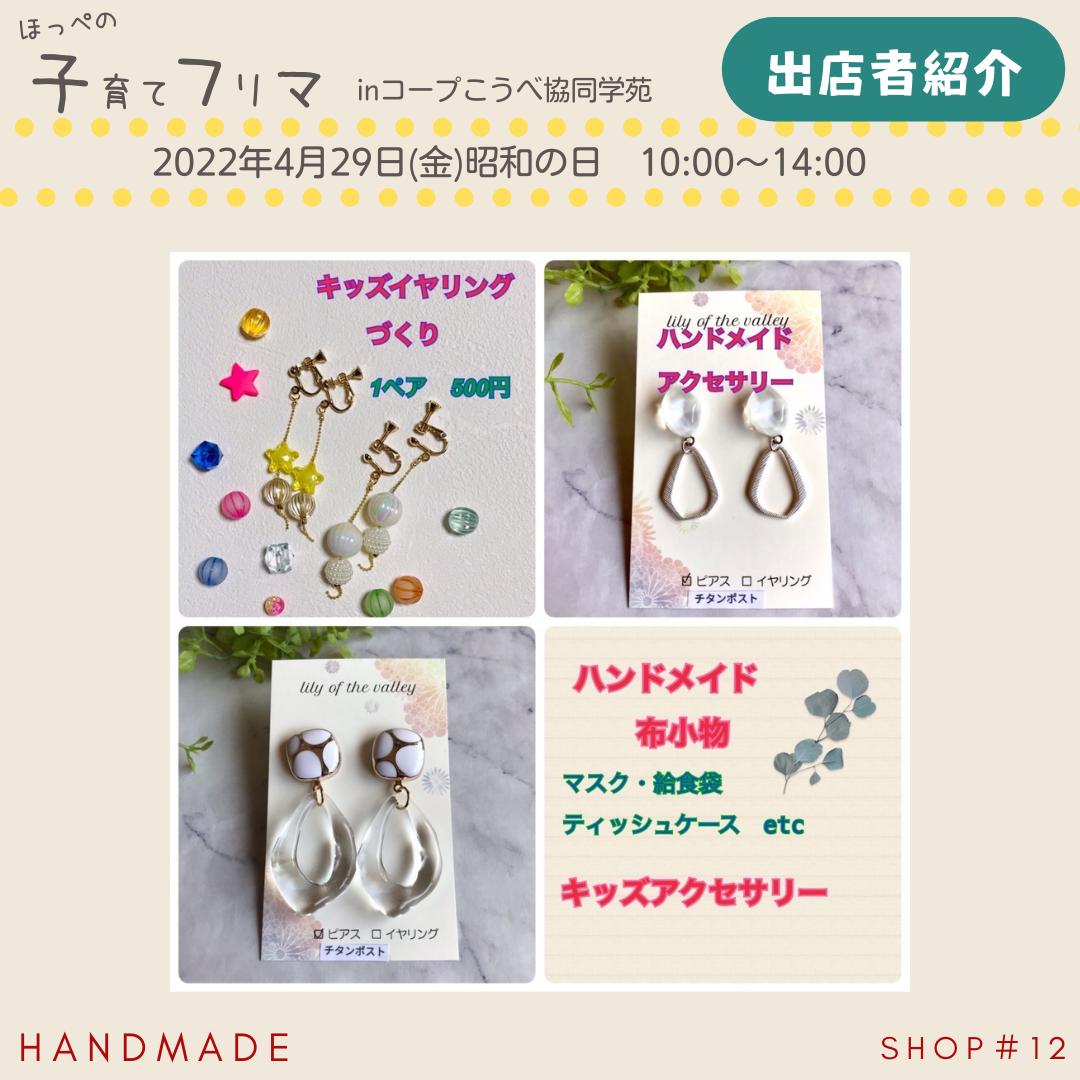 ほっぺの子育てフリマ 2022.03.192022.04.27 イベント詳細 日付: 2022-04-29 10:00 AM – 2:00 PM 会場: コープこうべ協同学苑 カテゴリ: イベント ブース紹介 画像をタップすると大きい画像が確認できます。